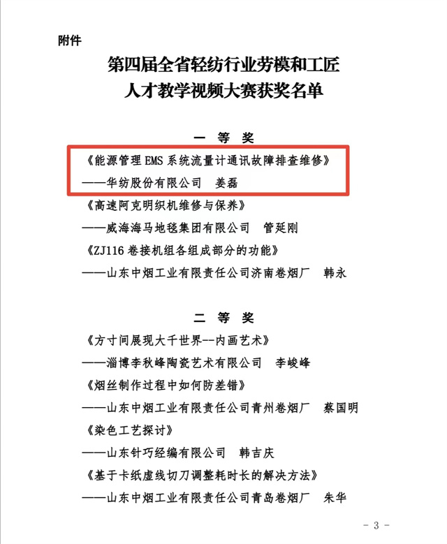 近日,山東省輕工紡織工會(huì)委員會(huì)組織開展的第四屆全省輕紡行業(yè)勞模和工匠人才教學(xué)視頻大賽評(píng)比結(jié)果揭曉,經(jīng)專家評(píng)審和網(wǎng)上公眾投票,評(píng)出一等獎(jiǎng)3名、二等獎(jiǎng)4名、三等獎(jiǎng)5名、優(yōu)秀獎(jiǎng)7名。公司電氣車間儀表技術(shù)員姜磊報(bào)送的《能源管理EMS系統(tǒng)流量計(jì)通訊故障排查維修》項(xiàng)目榮獲大賽一等獎(jiǎng)。